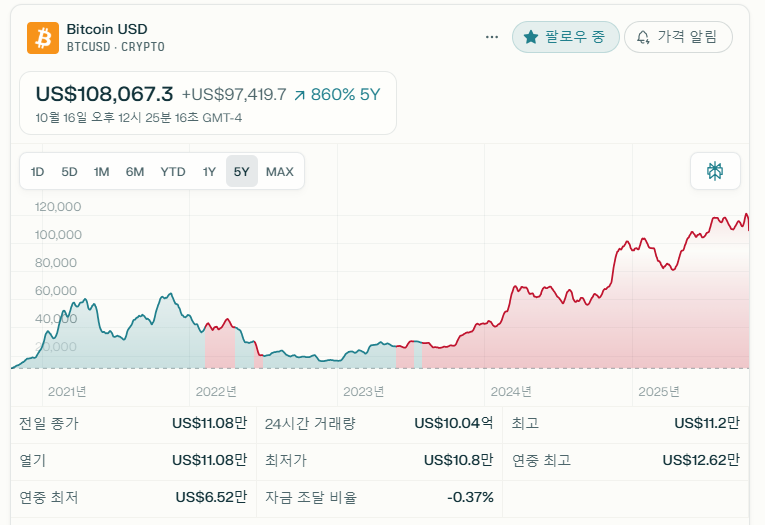 2025년 10월 기준, 글로벌 주요 거래소에서 비트코인은 111,000~115,000달러의 안정 구간을 형성하고 있습니다. ETF 승인, 반감기 효과, 대형기관(블랙록·Fidelity)의 자금 유입, 각국의 CBDC 개발이 복합적으로 작용해 강세 흐름을 유지 중입니다. 비트코인은 금리 정책과 인플레이션, 그리고 디지털 금융화 흐름 속에 “안전자산 및 가치 저장수단” 역할을 강화하고 있습니다.